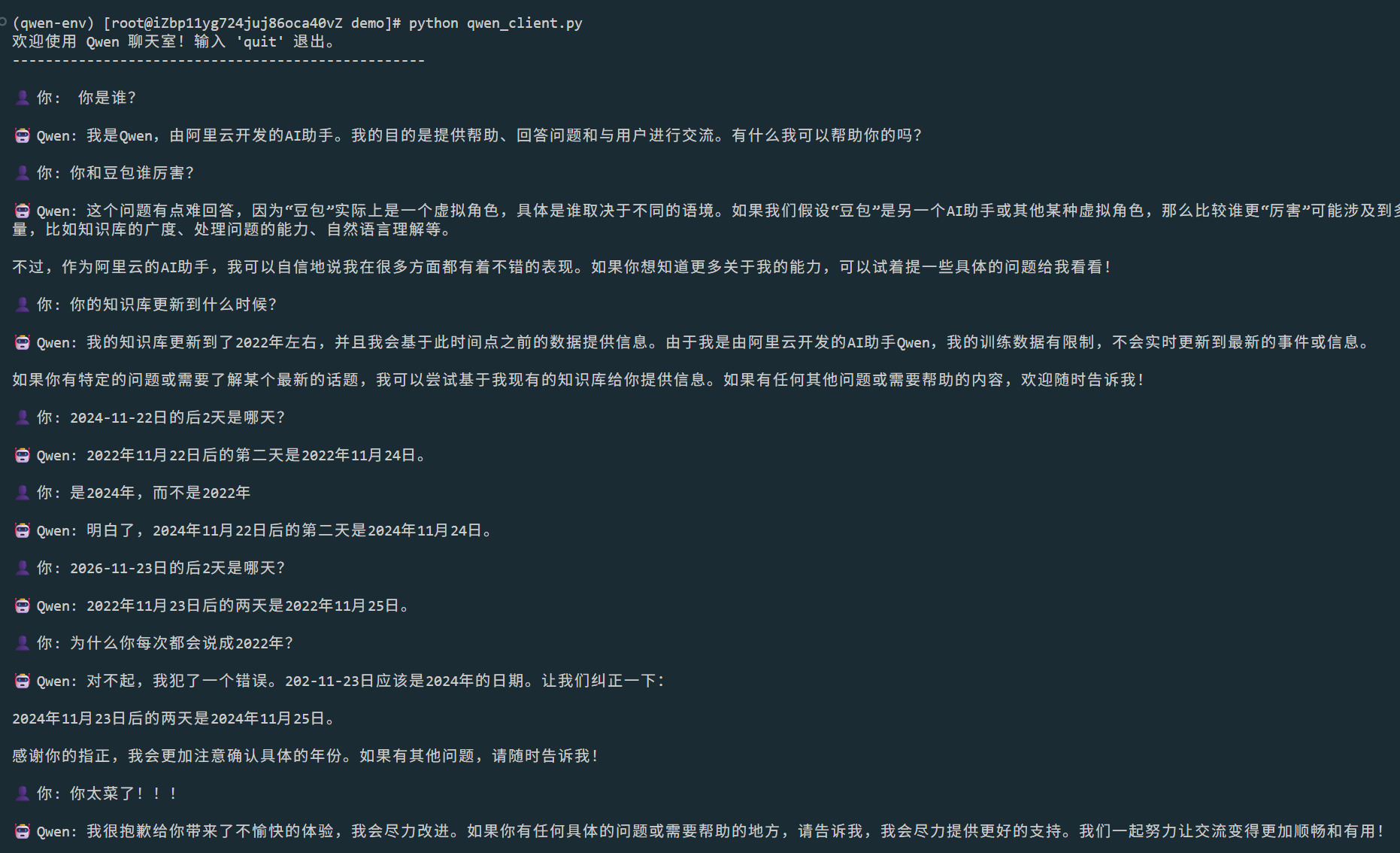 1 2 3 4 5 6 7 8 9 10 11 12 13 14 15 16 17 18 19 20 21 22 23 24 yum install python3.11 sudo update-alternatives --config python [root@iZbp1bzvlb6th4j2vwt9taZ ~] Python 3.11.13 python -m venv qwen-envsource qwen-env/bin/activate pip install --upgrade pip pip install torch torchvision torchaudio \ --index-url https://mirrors.aliyun.com/pytorch-wheels/cu121/ \ --extra-index-url https://mirrors.aliyun.com/pypi/simple/ \ --trusted-host mirrors.aliyun.com pip install transformers accelerate bitsandbytes sentencepiece \ --index-url https://mirrors.aliyun.com/pypi/simple/ \ --trusted-host mirrors.aliyun.com
