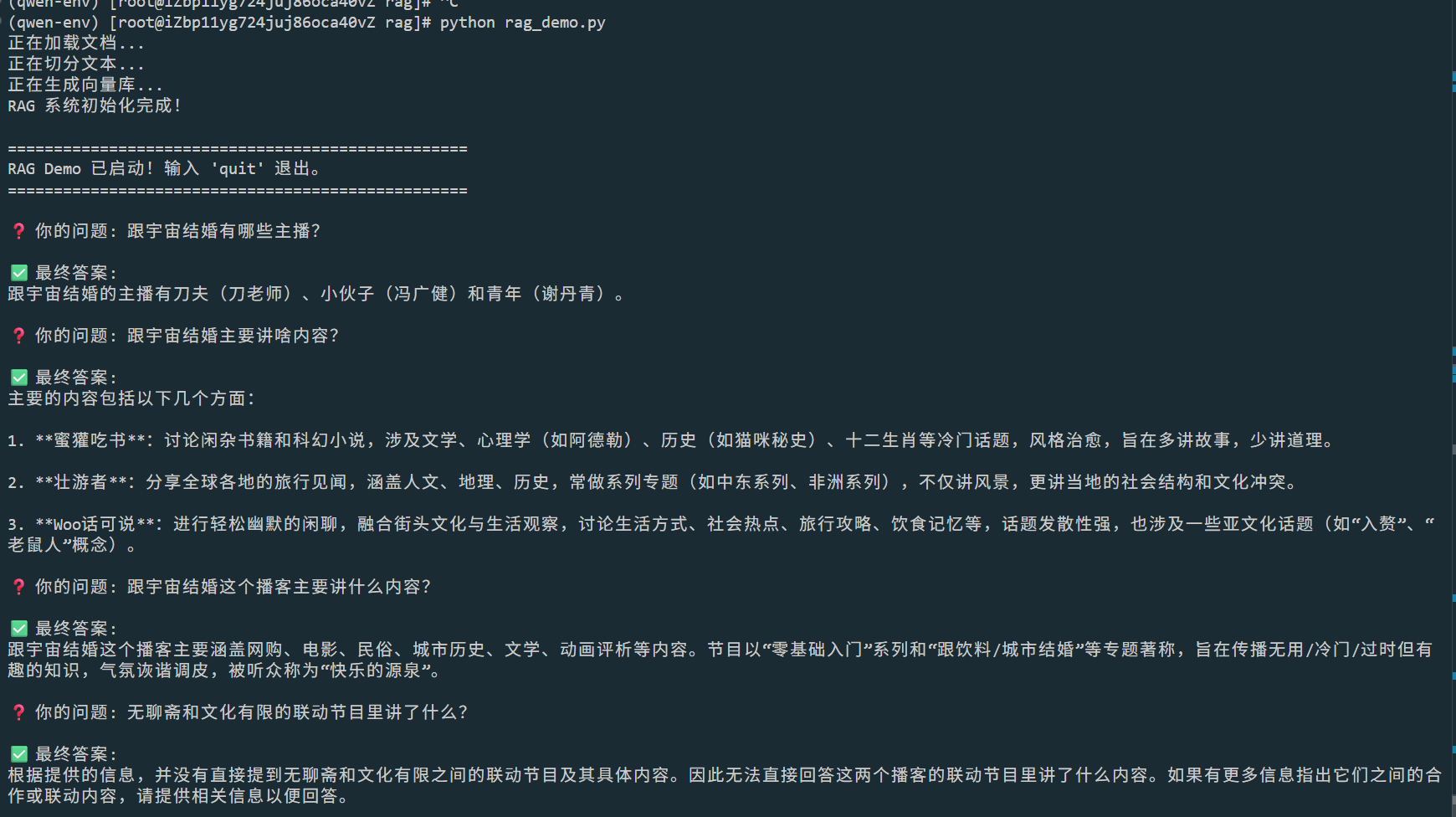 1 2 3 4 5 6 7 8 9 10 11 12 13 14 15 16 17 18 19 20 21 22 23 24 25 26 27 28 29 30 31 32 33 34 35 36 37 38 39 40 41 42 43 44 45 46 47 48 49 50 51 52 53 54 55 56 57 58 59 60 61 62 63 64 65 66 67 68 69 70 71 72 73 74 75 76 77 78 79 80 81 82 83 84 85 86 87 88 89 90 91 92 93 94 95 96 97 98 99 100 101 102 103 104 105 106 107 import osfrom langchain_community.document_loaders import TextLoaderfrom langchain_text_splitters import CharacterTextSplitterfrom langchain_huggingface import HuggingFaceEmbeddingsfrom langchain_community.vectorstores import FAISSfrom langchain_core.prompts import ChatPromptTemplatefrom langchain_core.runnables import RunnablePassthroughfrom langchain_core.output_parsers import StrOutputParserimport requestsimport json DOC_PATH = "podcast.txt" LOCAL_MODEL_PATH = "/root/.cache/modelscope/hub/models/AI-ModelScope/bge-small-en-v1___5" QWEN_SERVER_URL = "http://localhost:8000/v1/chat/completions" class RAGChain : def __init__ (self ): print ("正在加载文档..." ) loader = TextLoader(DOC_PATH, encoding='utf-8' ) documents = loader.load() print ("正在切分文本..." ) text_splitter = CharacterTextSplitter(chunk_size=500 , chunk_overlap=50 ) splits = text_splitter.split_documents(documents) print ("正在生成向量库..." ) embedding_model = HuggingFaceEmbeddings(model_name=LOCAL_MODEL_PATH) self.vectorstore = FAISS.from_documents(splits, embedding_model) self.retriever = self.vectorstore.as_retriever(search_kwargs={"k" : 2 }) print ("RAG 系统初始化完成!" ) def call_qwen_server (self, prompt ): """调用本地 Qwen 服务""" try : response = requests.post( QWEN_SERVER_URL, json={ "session_id" : "rag_user" , "message" : prompt } ) if response.status_code == 200 : return response.json()["response" ] else : return f"API Error: {response.status_code} " except Exception as e: return f"Connection Error: {e} " def invoke (self, question: str ): retrieved_docs = self.retriever.invoke(question) context = "\n" .join([doc.page_content for doc in retrieved_docs]) final_prompt = f"""你是一个问答助手。请根据以下检索到的信息回答问题。 检索到的信息: {context} 问题:{question} 请用中文回答:""" result = self.call_qwen_server(final_prompt) return resultif __name__ == "__main__" : rag = RAGChain() print ("\n" + "=" *50 ) print ("RAG Demo 已启动!输入 'quit' 退出。" ) print ("=" *50 ) while True : query = input ("\n❓ 你的问题: " ).strip() if query.lower() in ['quit' , 'exit' ]: break if not query: continue answer = rag.invoke(query) print (f"\n✅ 最终答案:\n{answer} " )